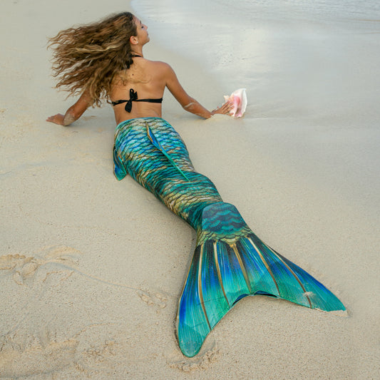 This special collection of tails includes fade-resistant, realistic scale patterns and tail designs with a touch of fantasy and added side and dorsal fins composed of a neoprene core that creates a dramatic effect in the water for a truly 3-dimensional look. The realistic silhouette of these premium mermaid tails will make onlookers wonder if they just saw a real-life mermaid!