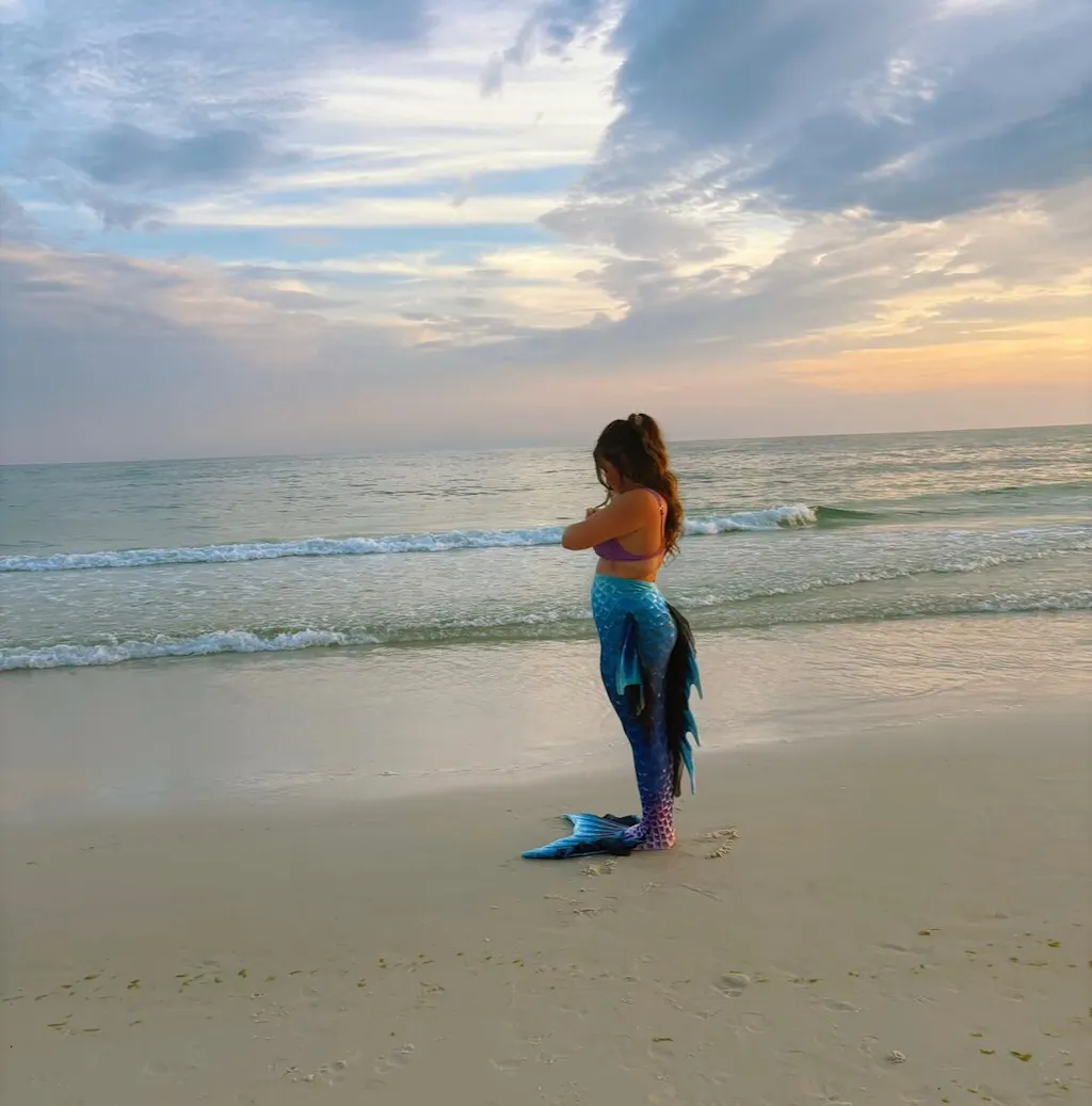 This tail is beautiful, I have bought from finfun many times and have never been disappointed!! I’m so happy I got this tail, the dorsal fin is stunning underwater and I can’t wait to start doing parties in my new tail!!! I ordered a medium and I’m usually a large, because over the course of buying so many I realized they run a bit bigger so you have room to move, as soon as I got in the water the tail suctioned to my body and I realized I made the right choice. If you are a beginner I recommend doing your normal size, because it would be much easier to get in and out of in water!!