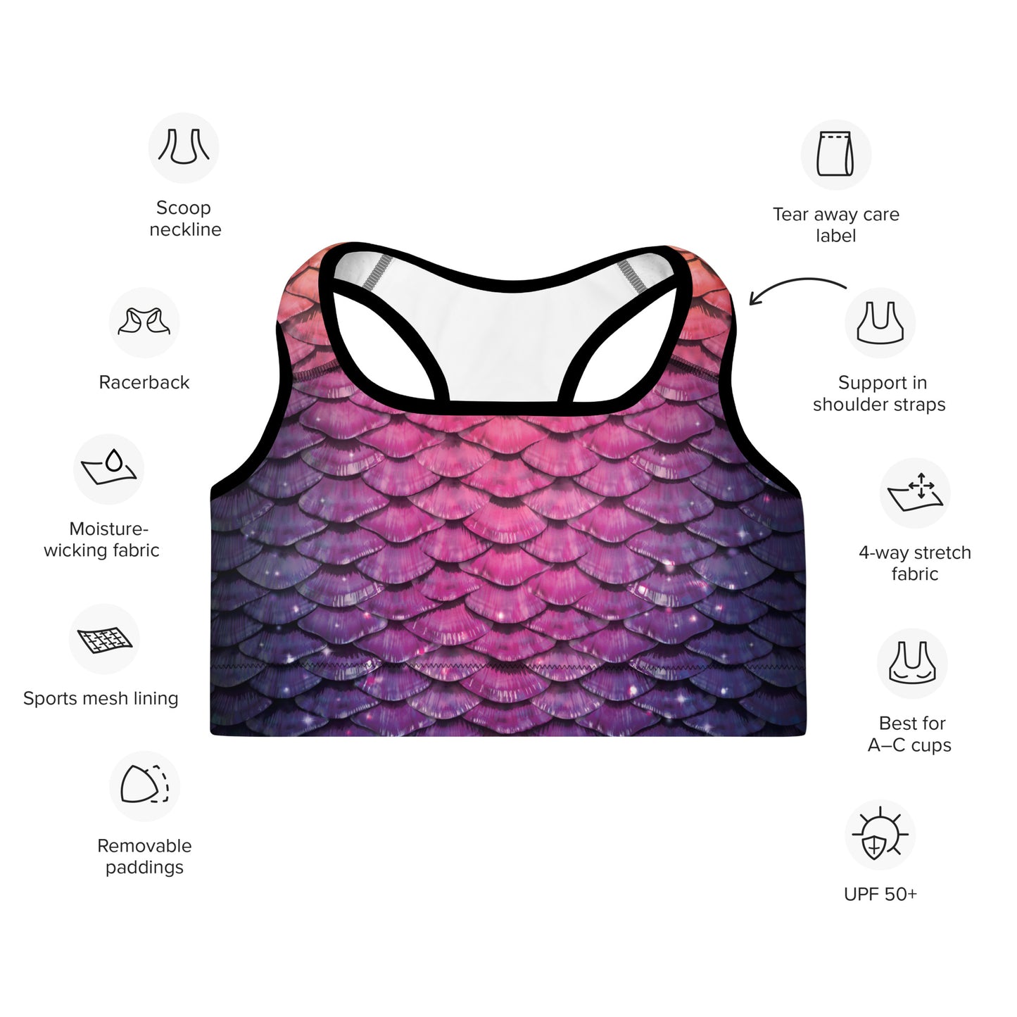 Get the perfect sports bra for your land and water workouts! This comfy bra has a soft moisture-wicking fabric, extra materials in shoulder straps, and removable padding for maximum support.
