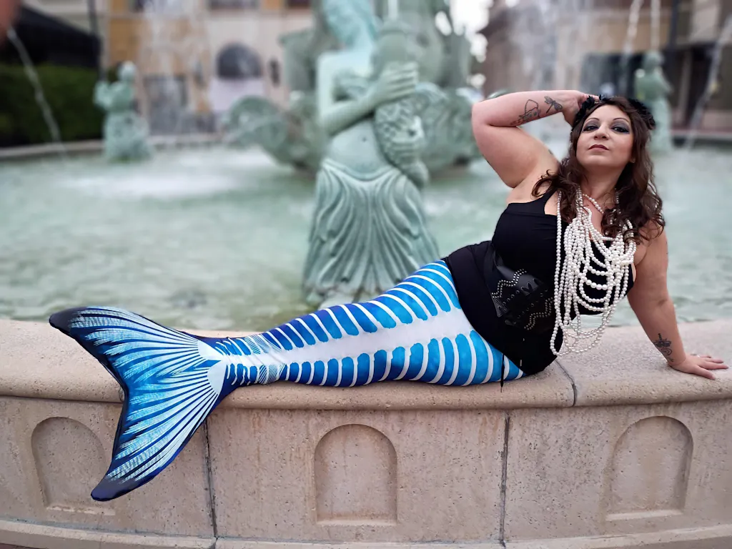 Haunt the seas this Halloween with the ghostly allure of our skeleton inspired Sunken Bones Mermaid Tail! This mesmerizing tail blends aqua blues, deep indigos, and shadowy blacks, creating the perfect backdrop for the skeletal bones cascading from waist to fin, transforming you into a mermaid from the depths of a forgotten sea. Channel your inner siren and captivate everyone with its haunting beauty this Halloween season!