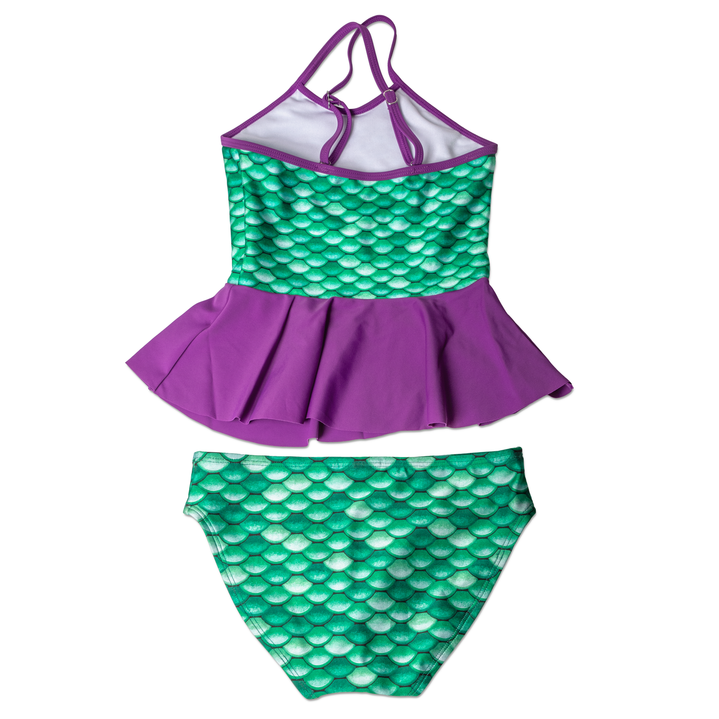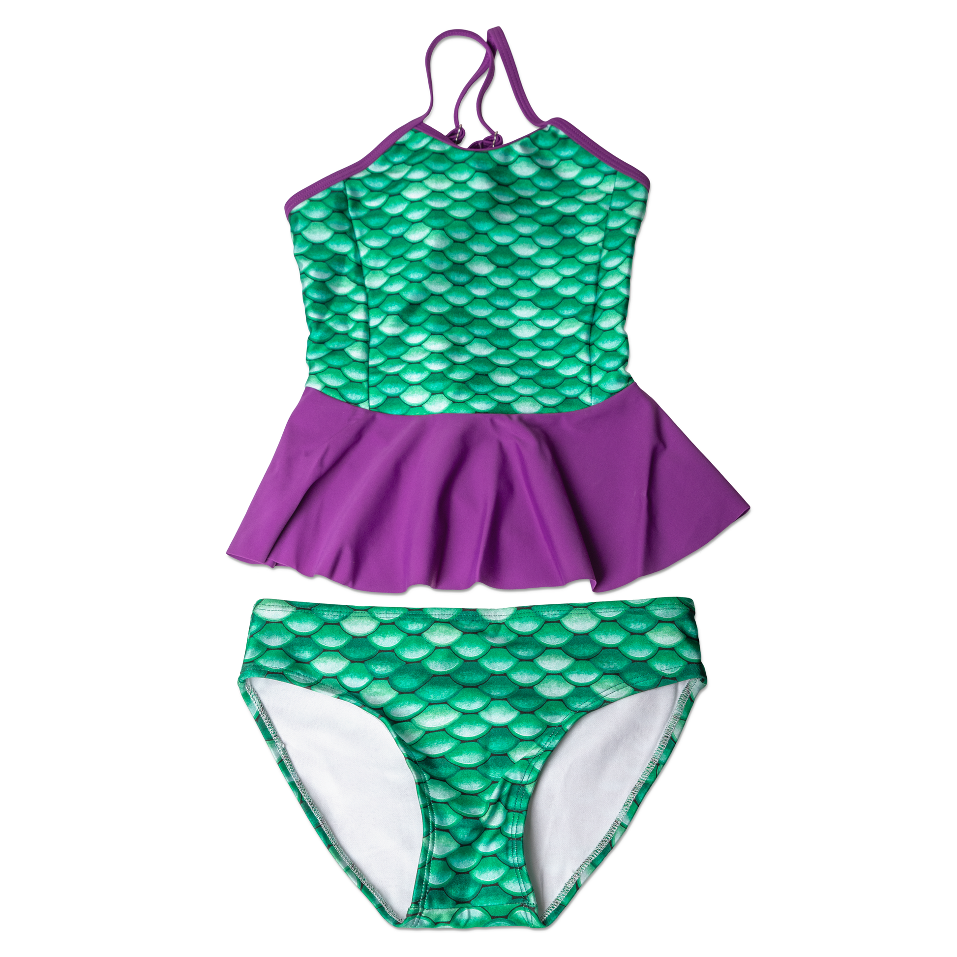 Yearning for a classic mermaid look reminiscent of the world’s most beloved mermaid? That’s what you’ll get with our Celtic Green design—and this version puts a trendy spin on the peplum style! This set features Celtic Green scales paired with a playful pop of magenta peplum for a fun, stylish twist! The tankini top features adjustable elastic straps for a customizable, secure fit, along with vertical seams and built-in lining for a flattering look. This set also includes the matching Celtic Green bikini bottom. Pair this tankini set with the Celtic Green mermaid tail for the complete mermaid transformation!