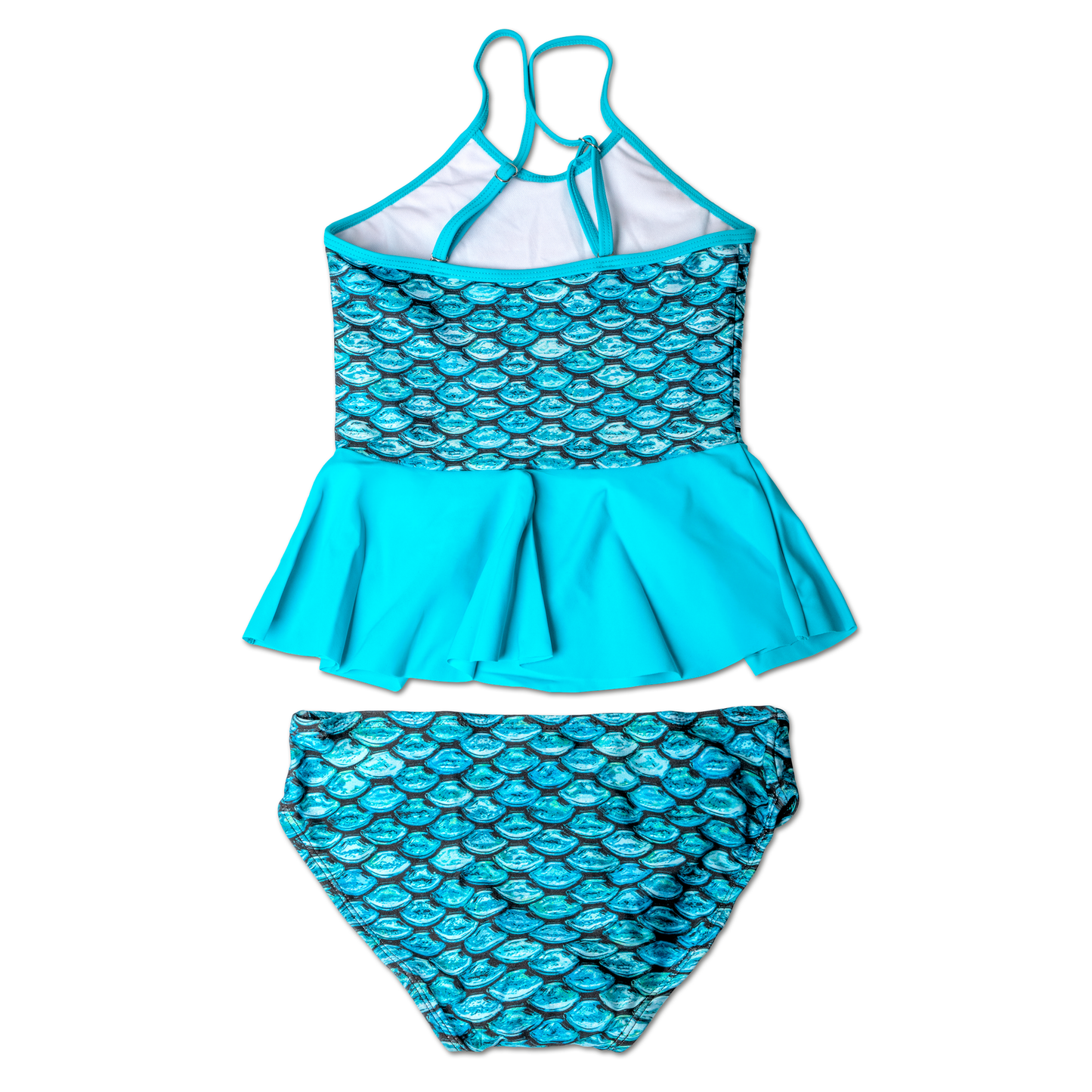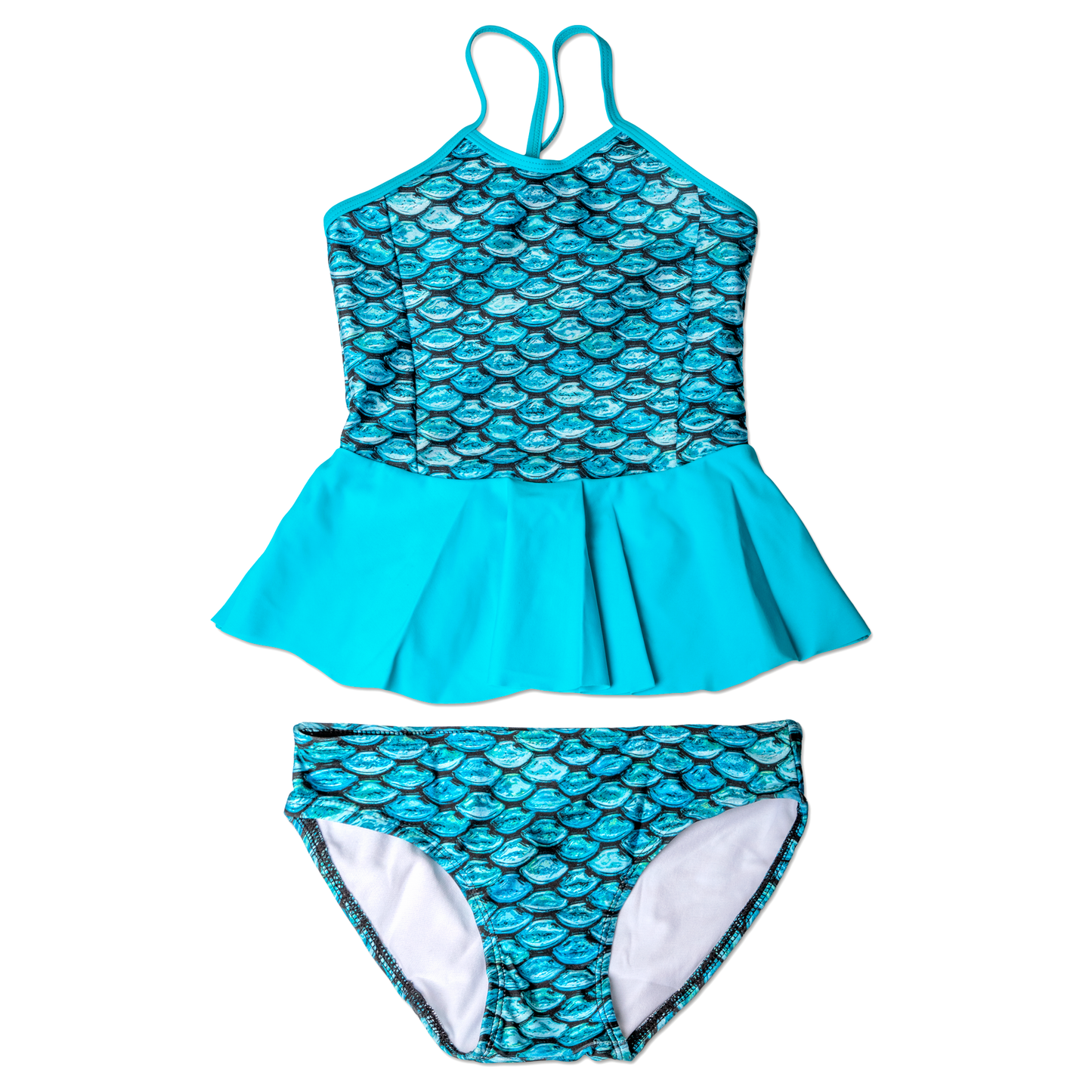 Fin Fun’s Tidal Teal Peplum Tankini Set is the perfect choice for a sea-loving mermaid. It features a playful aqua peplum that accents the rich blue-green shades of our Tidal Teal scale pattern. The tankini top features adjustable elastic straps for a customizable, secure fit, along with vertical seams and built-in lining for a flattering look. Matching mid-rise Tidal Teal scale bikini bottoms are included. Pair this tankini set with our Tidal Teal Mermaid Tail for the complete mermaid makeover!