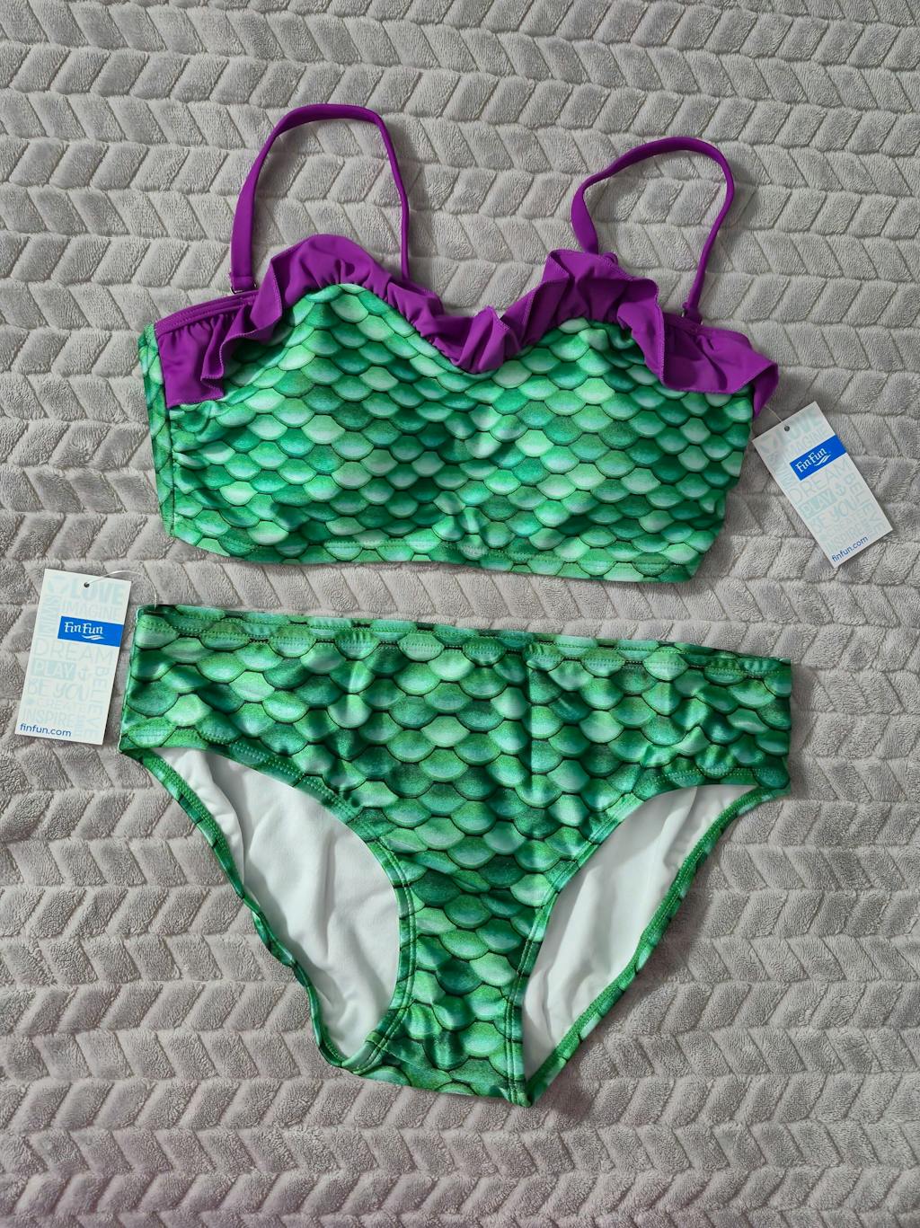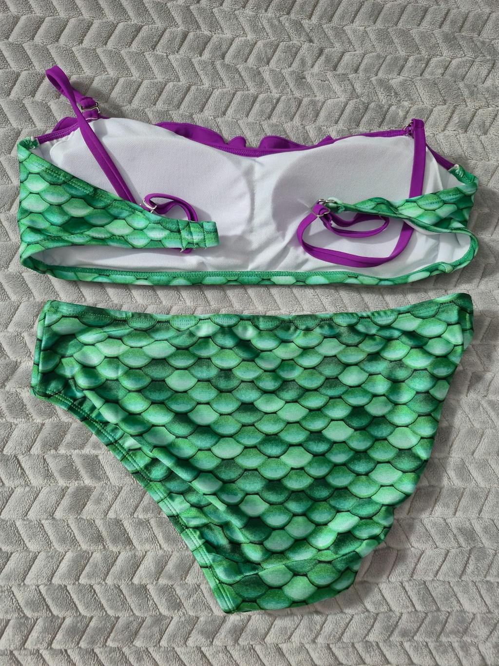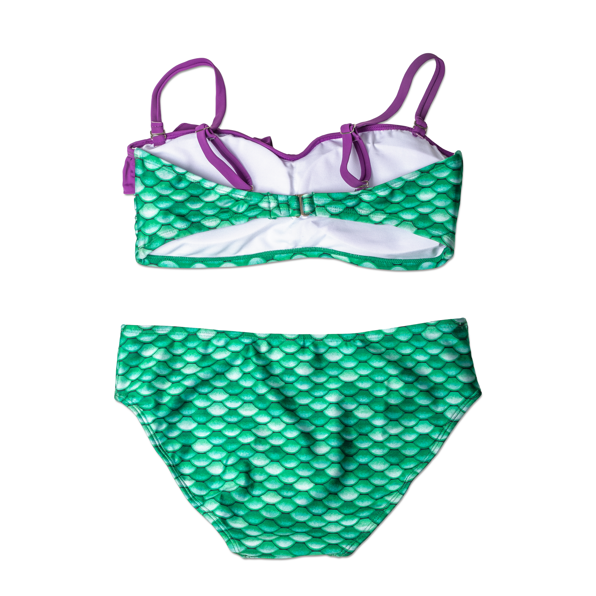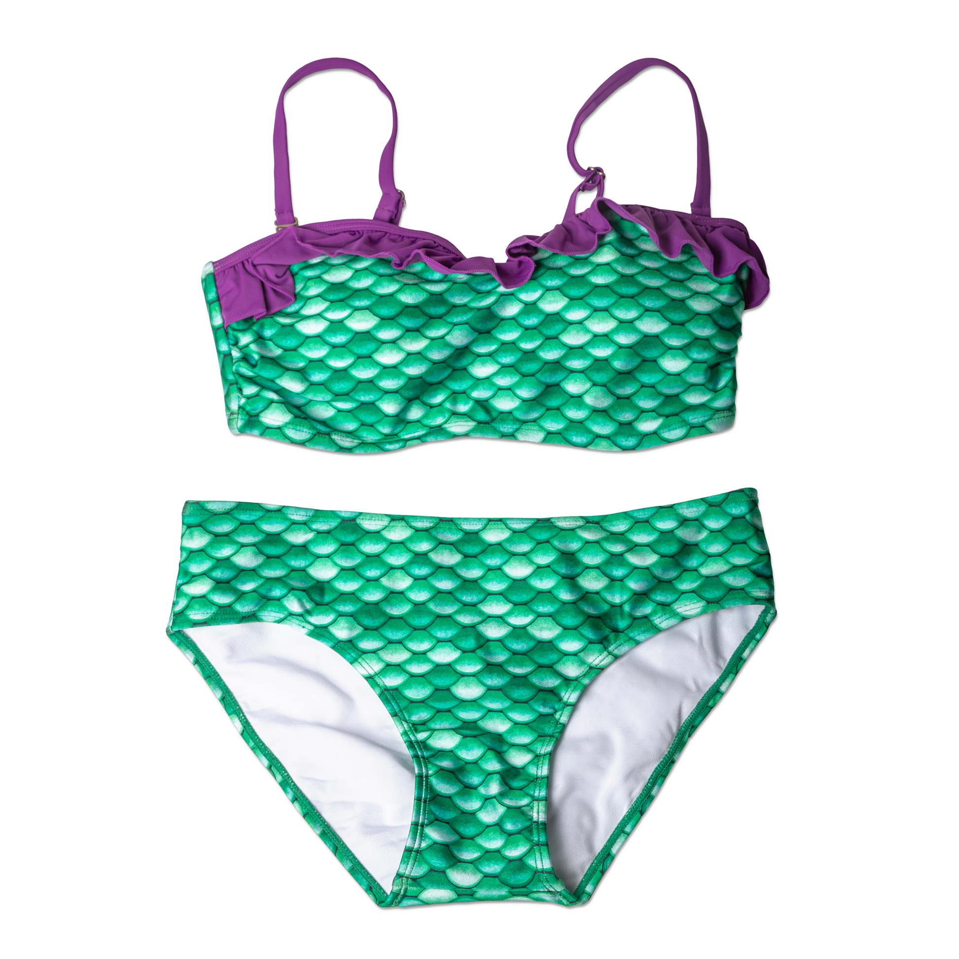 The rich and brilliant jewel tones of our Celtic Green Bandeau Bikini Set will have you dreaming of underwater adventure. The luscious purple ruffle on this bikini top combined with our gorgeous scale design makes a perfect combination. The bikini top is fully lined with cups and side boning for proper support, and features adjustable elastic straps for a secure, customizable fit. The convertible, removable straps offer endless styling options—wear it your way! Matching mid-rise Celtic Green scale bikini bottoms are included. Mix and match sizes to get the perfect fit!
